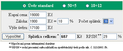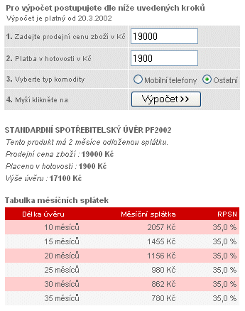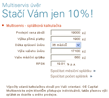 Na závěr ještě jedno srovnání, a výhodnosti splátkového prodeje. Pro připomenutí: u nejlacinější sestavy "Domů" v ceně 19 000 Kč požaduje Telecom při 10-procentní akontaci 36 splátek ve výši 625 Kč měsíčně. celkem tak zákazník místo původních 19 000 Kč zaplatí ve skutečnosti 24 400 Kč, a parametr RPSN (roční procentuelní sazba nákladů) vychází na 20,59%. Pro srovnání s jinými možnostmi splátkového prodeje jsem stejné výchozí podmínky zadal i do kalkulaček specializovaných finančních společností.