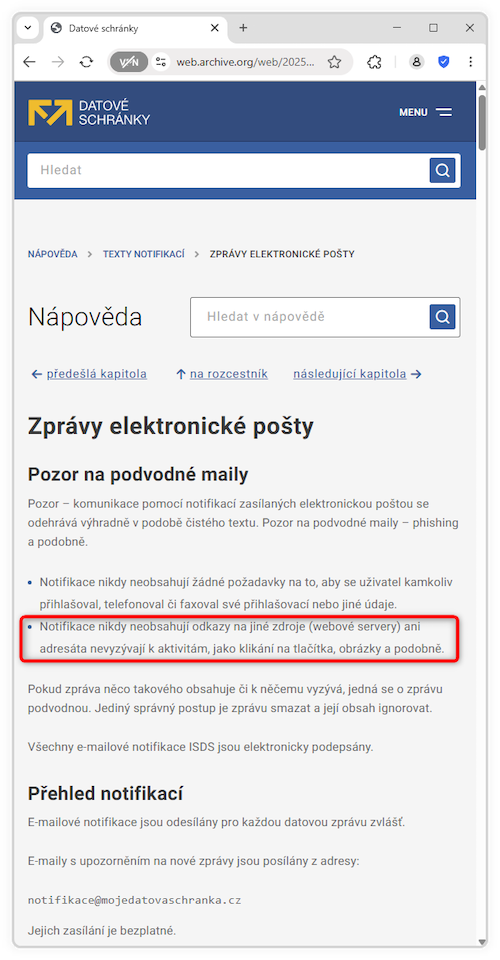 Notifikace od datových schránek byly skutečně rozesílány ve formátu čistého textu a neobsahovaly žádný aktivní odkaz. Tedy ani odkaz na samotný „vstup do datových schránek“, resp. klientský portál datových schránek. Naopak obsahovaly poučení pro uživatele, včetně zdůraznění absence jakýchkoli aktivních odkazů.