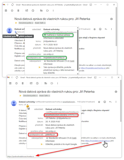 Stejně tak dnes již podporuje elektronické podepisování třeba hojně používaný Gmail, který u podvrženého e-mailu (ve spodní části následujícího obrázku) prozradí i to, odkud byl skutečně odeslán.