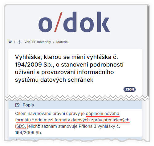 Pokud se ale na výše zmiňovaný návrh vyhlášky podíváte přímo do veřejného eKlepu, dočtete se, že nezavádí nový datový formát pro přílohy datových zpráv, ale nový datový formát přímo samotných datových zpráv, přenášených mezi datovými schránkami.