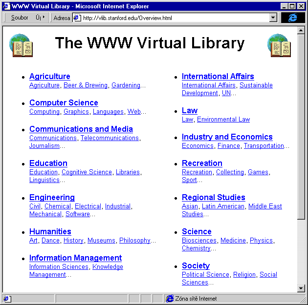 Mezi nejrůznějšími seznamy zdrojů, které po celém světě i v našem českém Internetu existují, má určité výsadní postavení tzv. Virtuální knihovna, dnes udržovaná lidmi ze Stanford University v USA. Jde v zásadě o seznam seznamů, neboli o celou soustavu různě tematicky zaměřených seznamů zdrojů, nad kterými existuje ještě jeden zastřešující seznam, evidující jednotlivé seznamy. Nejlépe je si představit, že tento zastřešující seznam má v péči koordinátor knihovny, a jeho úkolem je znát (a evidovat) konkrétní tematické seznamy zdrojů, včetně jejich přesných adres (URL odkazů) a také jejich individuálních správců (udržovatelů). Pokud se objeví zájemce o vytvoření takového seznamu zdrojů, který ještě není součástí virtuální knihovny, musí se tento zájemce domluvit s koordinátorem, a ten jej zanese do své evidence. Všechno další je pak již v moci toho, kdo nový seznam vede - je na něm, jak jej uspořádá, jak jej graficky ztvární, jak jej učiní rozsáhlým, jak často jej bude aktualizovat atd. Příklad domovské stránky celé virtuální knihovny (která je současně oním "seznamem seznamů") vidíte na obrázku. Najdete ji na adrese http://vlib.stanford.edu.