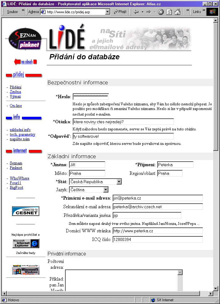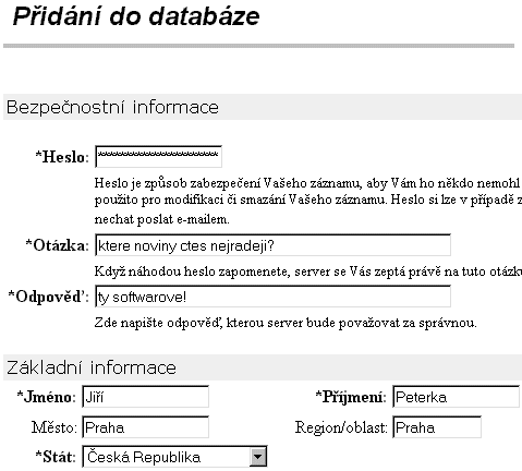 Rozhodnete-li se sami přidat do adresáře, vydejte se z hlavní domovské stránky (viz předchozí obrázek) a klikněte na odkaz "Přidej". Dostanete se na formulář, který se vás vyptá na příslušné údaje: