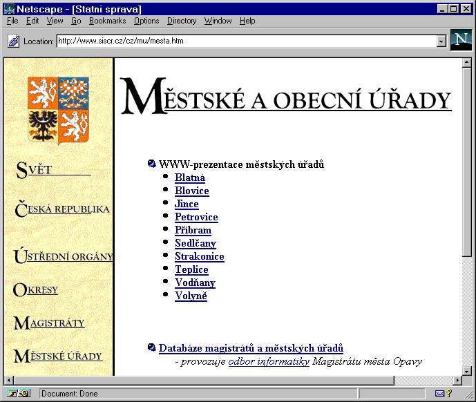 Jedním z možných výchozích bodů k hledání městských úřadů a magistrátů může být oficiální WWW server státní správy, který jsme poprvé navštívili v 5. dílu Toulek. Tu jeho část, která se týká právě městských úřadů (magistráty jsou zde zvlášť) vidíte na dnešním prvním obrázku [GIF1,URL1]. Podobně bychom se mohli podívat například na oblíbený Seznam (http://www.seznam.cz) do kategorie „Instituce" a podkategorie „Vládní a státní instituce", nebo do katalogu nedávno otevřené vyhledávací služby Atlas (http://katalog.atlas.cz) do kategorie „Instituce". Odkazů na městské úřady bychom zde ale našli jako šafránu, ještě méně než na WWW serveru státní správy (a zcela jistě méně, než kolik jich má nějakou formu internetové přítomnosti). Problém zřejmě není jen v tom, že příslušní provozovatelé neregistrují své stránky u správců nejrůznějších seznamů. Dalším důvodem může být i skutečnost, že mnohdy je velmi těžké rozlišit, kdy se ještě jedná o prezentaci městského úřadu, a kdy jde spíše o WWW stránky města jako takového, zaměřené na jeho pamětihodnosti, kulturu, přírodní krásy atd. Často jsou příslušné expozice kombinací obou motivů, a odkazy na ně je možné najít spíše v kategoriích kulturních, turistických či jinak zeměpisně orientovaných zdrojů.