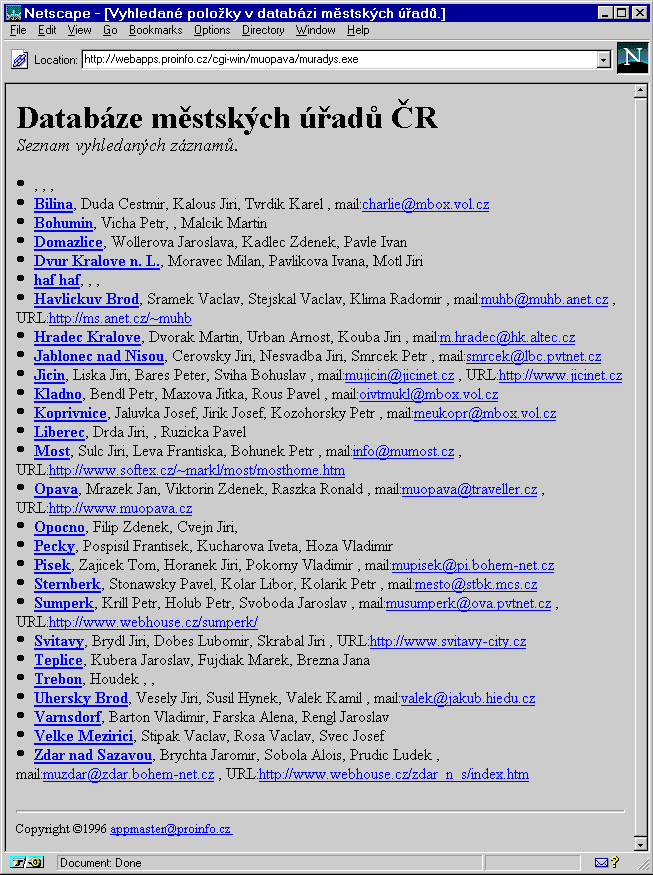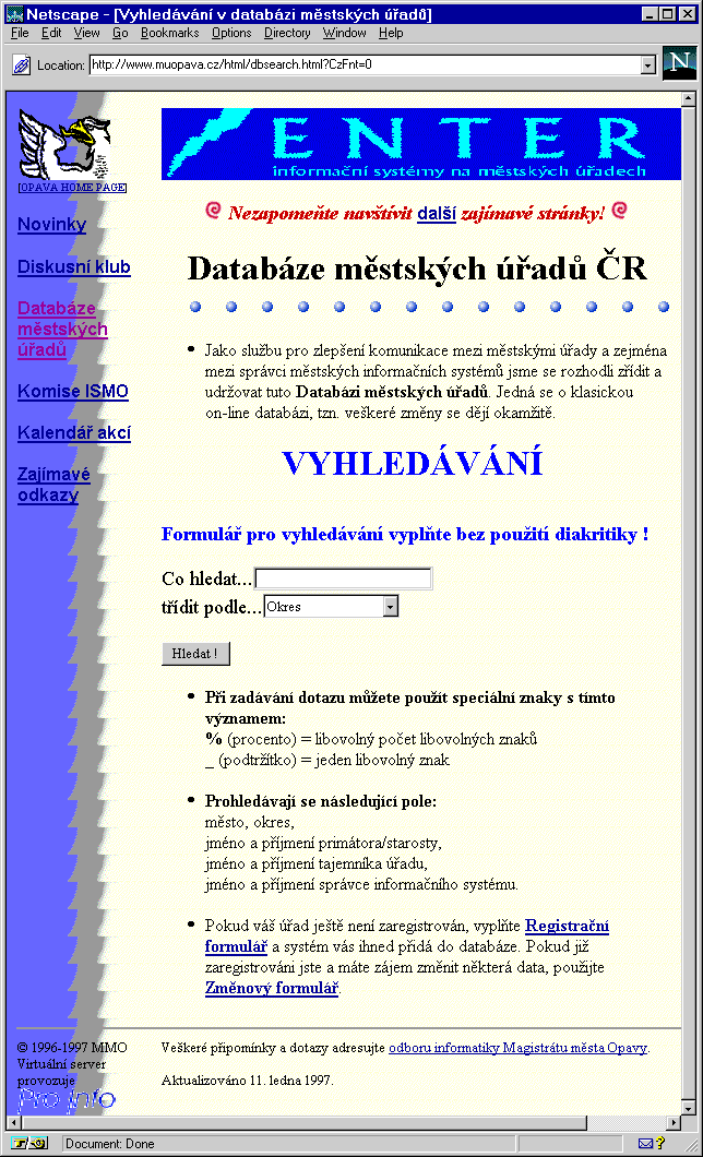 Zpět ale k samotným městským úřadům. Jak si můžete povšimnout ve spodní části dnešního prvního obrázku [GIF1,URL1], je zde odkaz na „Databázi magistrátů a městských úřadů", kterou provozují v Opavě, na odboru informatiky tamního magistrátu. O základní nabídce opavského serveru si můžete udělat představu z dnešního druhého obrázku [GIF2,URL2] - není to jen pouhé provozování jedné on-line databáze, ale spíše ucelenější WWW expozice, zaměřená na problematiku městských úřadů a jejich informačních systémů. Pojďme se ale nejprve podívat na samotnou databázi městských úřadů - její vyhledávací formulář vidíte na dnešním třetím obrázku [GIF3,URL3]. Pokud si pozorně přečtete podrobnosti o zadávání dotazů, zjistíte že zde používají poněkud netradiční tvar tzv. „zástupných znaků" - místo obvyklé hvězdičky (představující libovolný počet libovolných znaků) a otazníku (jeden libovolný znak) zde používají znak procenta a podtržítko. Takže na to pamatujte, budete-li s touto databází pracovat.