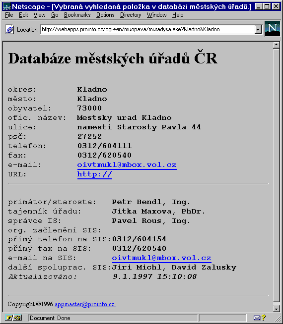 Když jsem na dotazovacím formuláři zadal znak procenta, aby mi vyhledal všechno, dostal jsem výsledek který vidíte na čtvrtém obrázku [GIF4](je uspořádán abecedně podle jména města, ale jsou možná i jiná uspořádání, například podle okresů). Jak můžete sami vidět, databáze není příliš objemná (ale ono městských úřadů také nejsou tisíce). Údaje, které vidíte na čtvrtém obrázku jsou pouze základní orientační údaje, a k dispozici jsou i údaje podrobnější - příklad vidíte na pátém obrázku [GIF5]. Pro naplňování databáze a její aktualizaci se zřejmě počítá zejména s aktivitou samotných městských úřadů. Pro ně je k dispozici registrační formulář (pro první zadávání údajů), i formulář aktualizační. Odkazy na oba tyto formuláře vidíte v dolní části dnešního třetího obrázku.