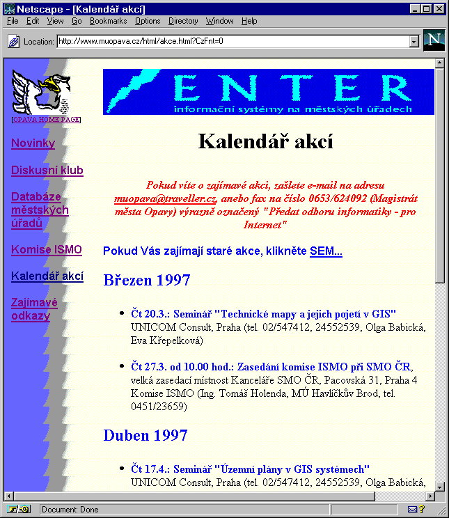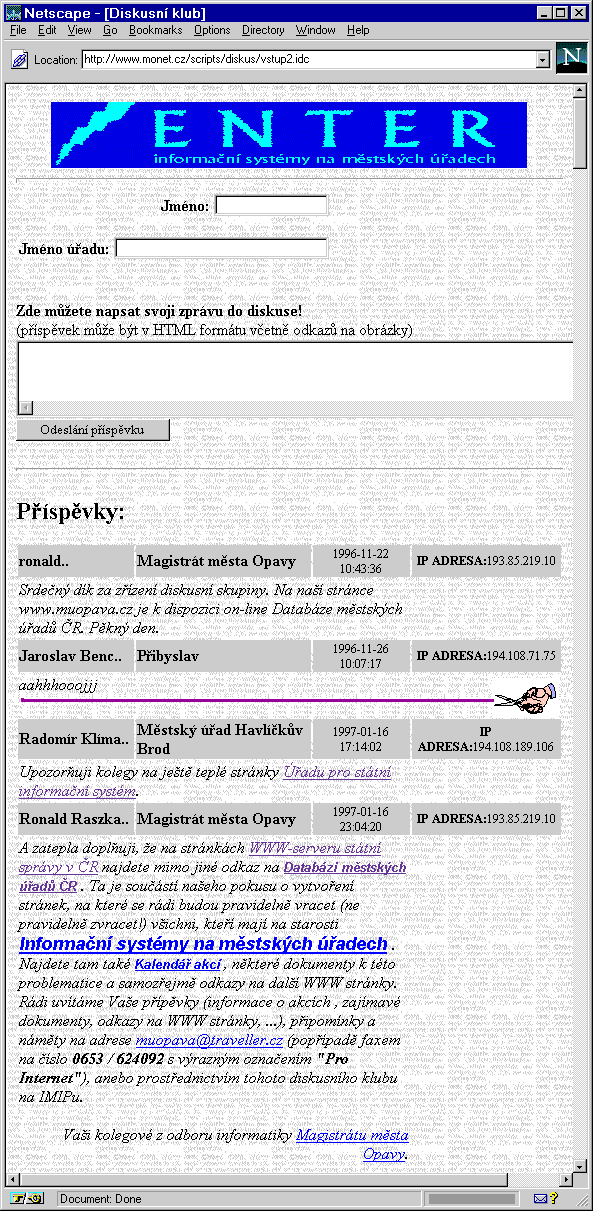Další sympatickou aktivitou, které se v Opavě podujali, je vedení kalendáře akcí týkajících se městských informačních systémů (viz šestý obrázek [GIF6,URL6]), a zveřejňování dokumentů a písemností týkajících se jednání komisí ISMO (zřejmě: Informační systémy měst a obcí). Velmi užitečnou, a k mému osobnímu překvapení i hojně využívanou možností je diskusní klub - ten sice fyzicky provozují v Praze (v Institutu městské informatiky), ale jeho celkový „image" zapadá do Opavské „expozice". Diskusní klub (viz sedmý obrázek [GIF7,URL7]) dává uživateli možnost napsat svou zprávu přímo do formuláře v záhlaví stránky, takže není nutné používat ani samostatný poštovní program. Navíc má toto řešení výhodu i v tom, že do jednotlivých příspěvků je možné vkládat i HTML kód, a tak vytvářet například aktivní odkazy, či alespoň dosáhnout atraktivnějšího formátování textu. Příklad využití této možnosti vidíte v dolní části sedmého obrázku.