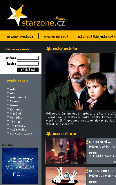 Základní strukturu nabídky filmů vidíte již na předchozím obrázku (ve střední části vlevo). Nejvíce titulů (celkem 17) lze již nyní nalézt v sekci "pro dospělé" (adult), jejíž obsah se ale zobrazuje jen přihlášeným uživatelům (tj. jen zákazníkům Telecomu). Totéž platí pro sekci "horor", kde je pouze 1 titul (Hluboko v lesích). Obsah ostatních sekcí si mohou vypsat všichni, a podívat se i na podrobnosti o každém titulu.