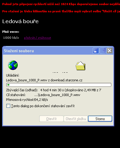 Nápověda k portálu sice slibuje, že si před začátkem stahování budete moci vybrat z různých formátů, a tím i různých velikostí (objemů dat pro stažení). Já jsem ale při včerejším testování narazil vždy jen na jeden formát (viz následující obrázek, část na černém pozadí - zde by mělo být více řádek). U celovečerního filmu pak vycházela doba pro stažení na několik hodin (na přípojce s nominální rychlostí 512 kbit/s). Všechny stahované filmy (i budoucí hudební tituly) jsou ve formátu Windows Media Audio/Video (WMA, WMV).