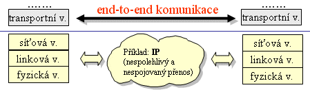 Ani menší počet vrstev v TCP/IP však nemění nic na tom, že transportní vrstva je první vrstvou (počítáno odspodu), která je přítomná až v koncových uzlech, a nikoli ve vnitřních uzlech sítě (ve směrovačích). Vzhledem k tomu má na starosti vzájemnou komunikaci koncových uzlů, pro kterou se i češtině vžilo označení, pocházející z angličtiny: end-to-end komunikace (doslova: komunikace "konec-konec").