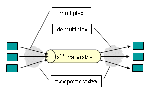 Můžeme si to celé představit také tak, že síťová vrstva vytváří přenosový kanál, který je společně využíván všemi odesilateli, resp. příjemci na daném uzlu, s tím že až transportní vrstva zajišťuje na straně odesilatele potřebné "sloučení" (multiplex) dat od různých odesilatelů, do jednoho datového toku, a na straně příjemce zase potřebné "rozbočení" (demultiplex) těchto dat podle toho, komu jsou určena. Vše naznačuje i následující obrázek č. 7, který je oproti obvyklým konvencím jakoby pootočen o 90 stupňů.