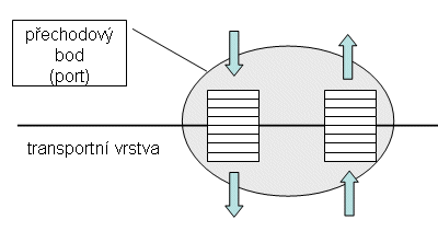 Příslušné adresování, používané na úrovni transportní vrstvy, však není založeno přímo na představě poskytovatelů služeb. To by nemuselo být až tak šikovné, a třeba by to bylo někdy i omezující. Místo toho je použit jiný koncept, založený na představě "přechodových bodů" mezi transportní vrstvou a vrstvou bezprostředně vyšší (což je ISO/OSI vrstva relační), a u TCP/IP vrstva aplikační. Tyto přechodové body jsou určitou abstrakcí, kterou je nejlépe si připodobnit k vyrovnávají paměti (bufferu) s režimem fronty: z jedné strany se do přechodového bodu určitá data vkládají (zapisují), a z druhé strany se z ní ve stejném pořadí vyjímají (čtou). Představu ilustruje následující obrázek (č. 9).