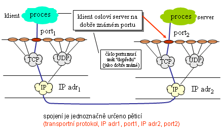 Klient (uživatelův browser) přitom dopředu ví, že takovýto proces je sdružen (asociován) s portem číslo 80, a tak jej adresuje právě tomuto portu. Proces, který na adrese www.earchiv.cz funguje jako WWW server, tak požadavek dostane, a v odpovědi na něj zašle klientovi požadovanou WWW stránku (index.php3). Přitom také musí uvést nějaké číslo portu, na které má být odpověď klientovi doručena. Server tedy standardně posílá svou odpověď na stejný port (na straně klienta), ze které mu přišel původní požadavek.