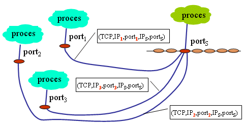 Jen pro ilustraci si naznačme ještě to, jak může jeden WWW server současně poskytovat své služby, skrze jeden a ten samý port (číslo 80), více klientům. Když mu všichni posílají své požadavky na stejnou adresu (IP adresa, port č. 80), jak pozná od koho co pochází a kam má zaslat požadovanou WWW stránku? Odpověď je principiálně jednoduchá a stejná pro všechny druhy serverů: u každého požadavku si pamatují, ze kterého spojení přišel. A toto spojení je obecně určeno pěticí údajů: