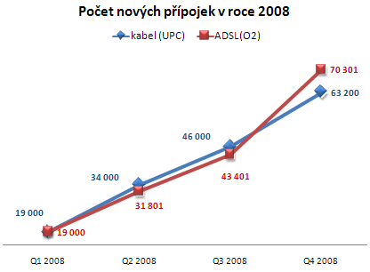 Zde už jasně vidíme, že za celý rok 2008 jsou počty nově zřízených kabelových přípojek (od UPC) velmi blízké počtu nových ADSL přípojek (přesněji: těch, které TO2 CR prodala sama koncovým zákazníkům, v rámci svého maloobchodu). V průběhu roku přitom kabel od UPC dokonce vedl, ale ADSL díky svému finiši v závěru roku nakonec přeci jen zvítězilo.