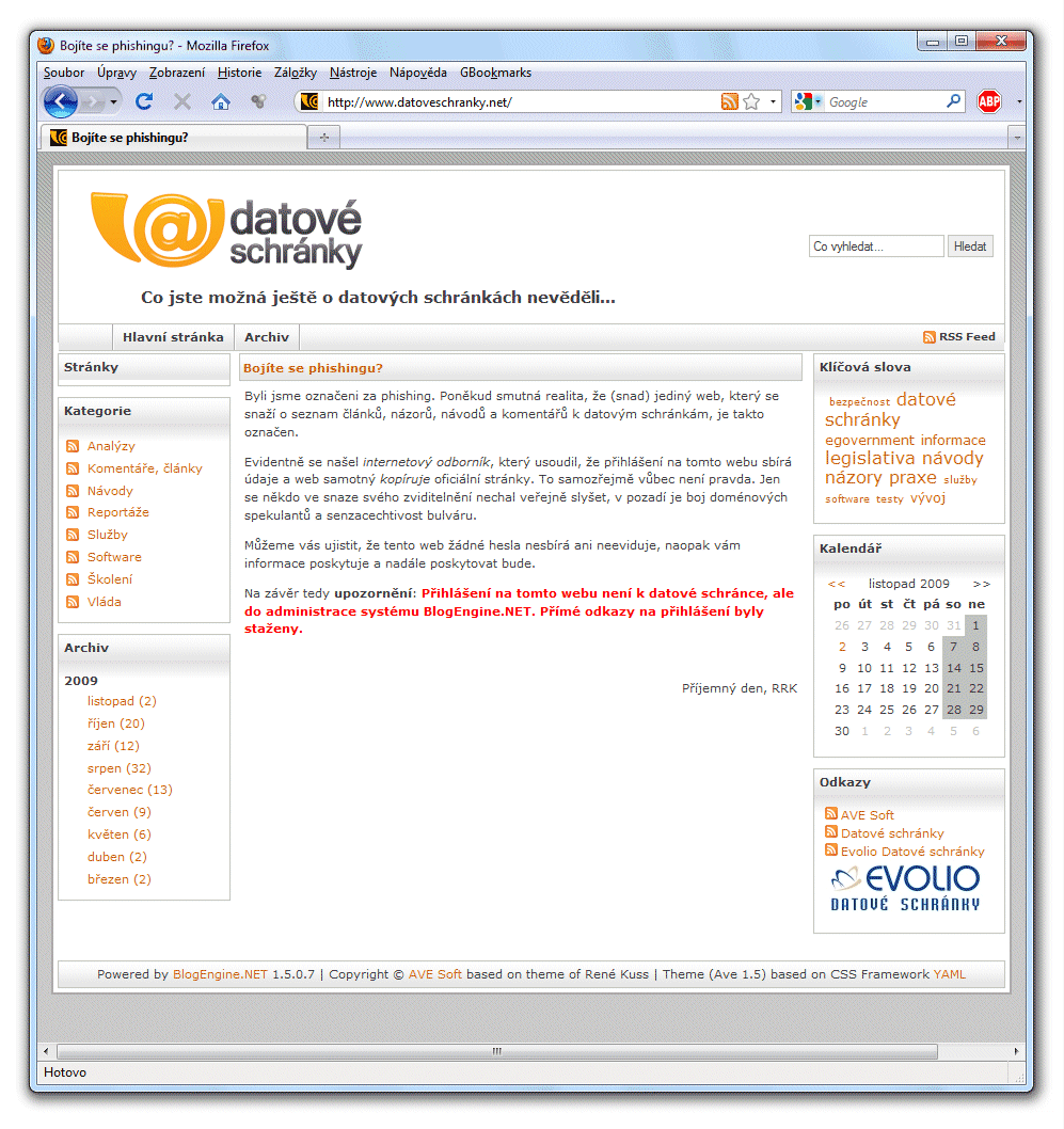 První informace o tom, že na webu jsou dostupné jakési „alternativní“ datové schránky, se objevily v médiích již počátkem tohoto týdne (příklad), a zmíněny byly i v diskusích zde na Lupě. Pokud se na ně ale podíváme (viz následující dva obrázky, ukazující jejich „prvotní“ stav), pak klasický phishing moc nepřipomínají, protože jsou zcela odlišné od webových stránek skutečného informačního systému datových schránek. Nicméně i tak jim někdo mohl naletět (třeba i přes varování Firefoxu).