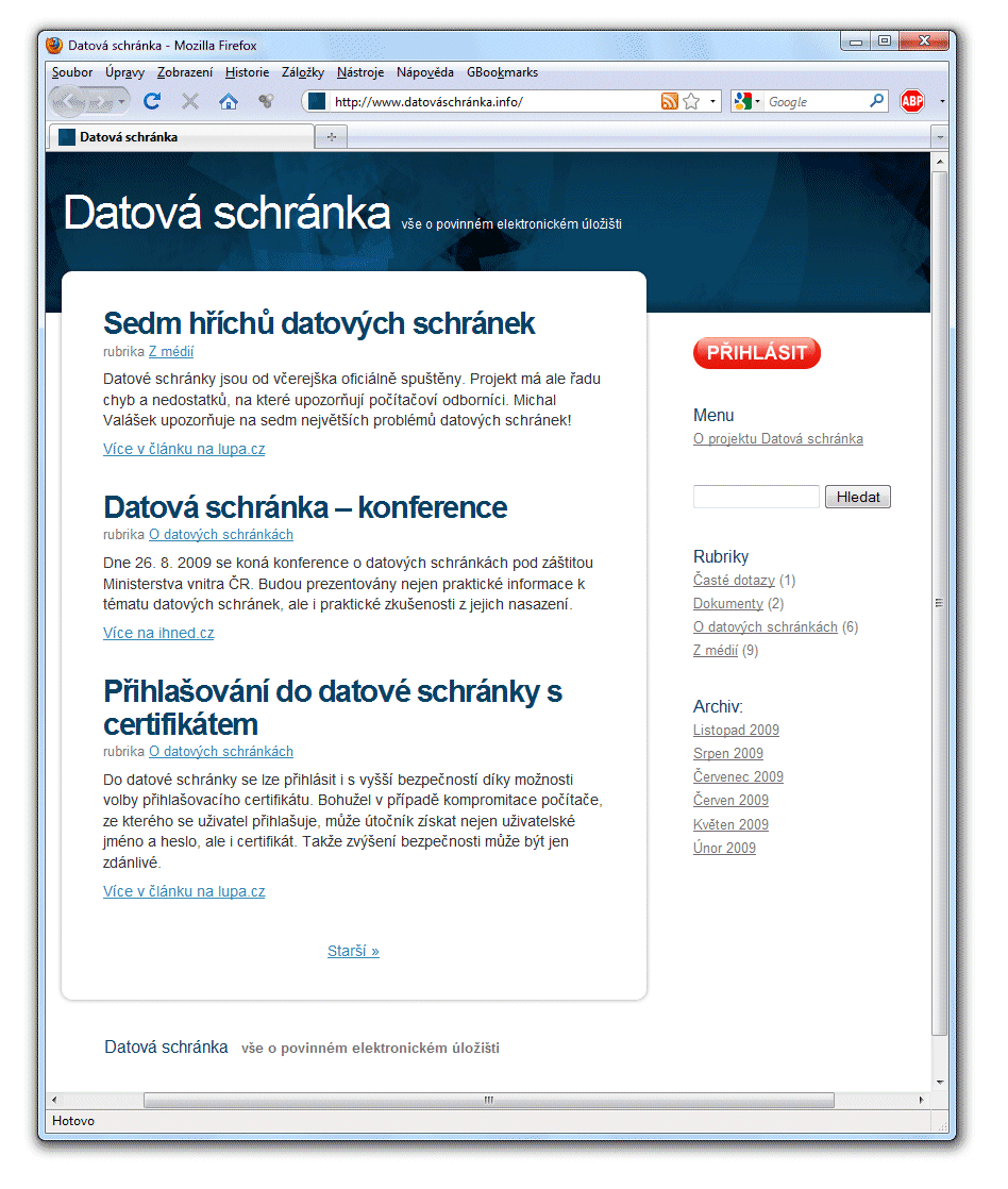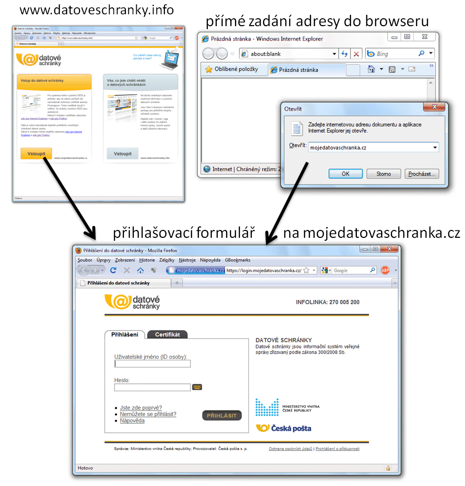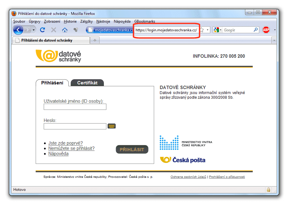 ... přihlášení do datové schránky (i chod celého webového portálu ISDS) se odehrává na doméně mojedatovaschranka.cz