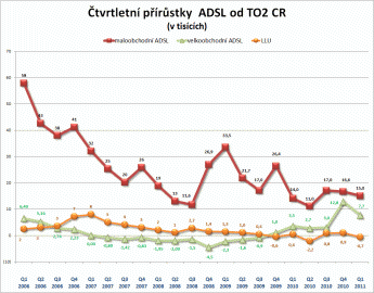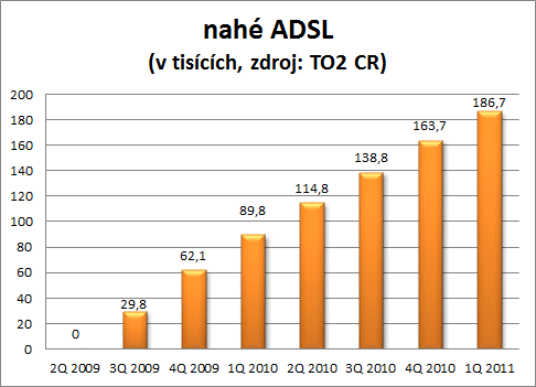 Z tohoto obrázku je ale také patrné, že nově zřízených přípojek nahého ADSL (23 tisíc) je přibližně stejně, jako celkový počet přírůstků ADSL (22 tisíc, viz výše). To by mohlo naznačovat, že většina nově zřizovaných přípojek je již „nahá“ – ale jisté to není, protože z provozních statistik toto nevyplývá.