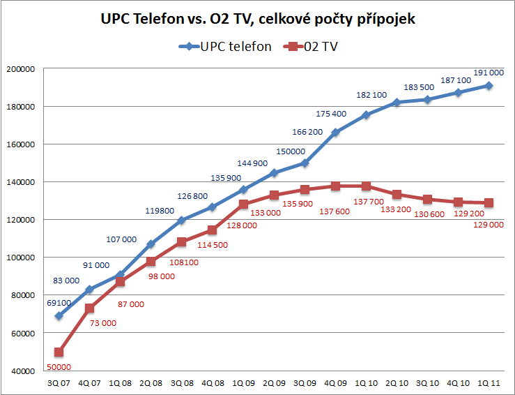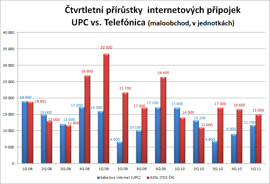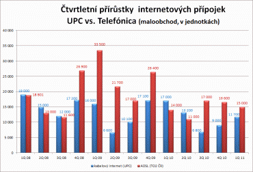 Jak ukazuje obrázek, UPC vykázalo za 1Q2011 celkem 11 700 nových přípojek, zatímco Telefónica vykázala přírůstek 15 000 (u svého maloobchodního ADSL). Rozdíl oproti předchozímu čtvrtletí se tak zmenšil – ale jelikož nevíme, jak velkou měrou se na maloobchodních přírůstcích Telefóniky podílela transakce s VOLNÝm, nemůžeme si být jisti ani tím, že ADSL porazilo kabel. Mohlo to být i naopak.