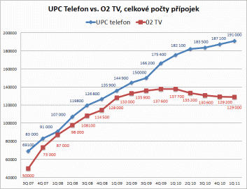 Přehlednější je situace v jiném tradičním souboji mezi Telefónikou a UPC: v počtech telefonních linek, zřízených UPC, oproti počtu TV služeb od Telefóniky (v podobě její O2TV). Jak ukazuje předchozí obrázek, zde UPC jasně vítězí: jemu telefony přibývají, zatímco Telefónice zákazníci její O2TV a naopak ubývají. Byť už přeci jen pomaleji než dříve.