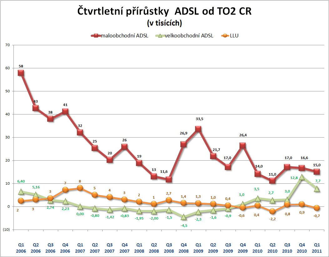 Výsledky za první letošní kvartál jsou významně ovlivněny i krokem, ke kterému se odhodlal nový vlastník (Dial Telecom) dříve významného hráče na poli „alternativního“ ADSL, společnosti VOLNÝ: své rezidenční zákazníky ADSL přenechal Telefónice O2 CR.