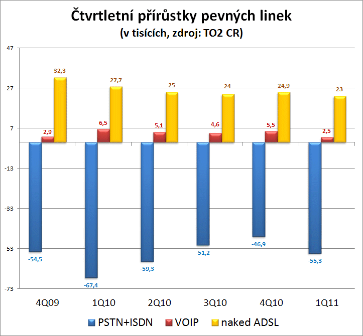 Když už jsme ale u těch statistik: Telefónica zahrnuje nahé ADSL mezi „pevné linky“, spolu s klasickými telefonními linkami (POTS a ISDN) a VOIP linkami. A jelikož právě nahé ADSL roste, alespoň částečně to kompenzuje úbytky klasických telefonních linek – a zřejmě jen díky tomu si Telefónica může dovolit (ve své tiskové zprávě) mluvit o „dalším zpomalení poklesu pevných linek“. Protože těch „klasických“ za 1Q2011 ubylo opět více než dříve, za předchozí dva kvartály.