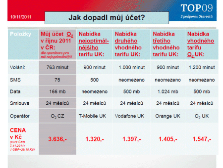 Poslanec Jan Husák tomuto britskému kalkulátoru předložil svůj telefonní účet, a nechal si vyhledat nejvhodnější nabídku od britského operátora. Výsledek vidíte na obrázku, převzatý z jeho prezentace, již po přepočtu na koruny a v cenách s DPH: