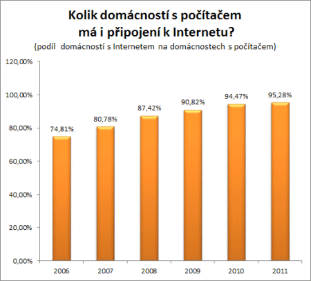Český statistický úřad včera zveřejnil výsledky svého šetření na téma „Internet v českých domácnostech 2006-2011“, prováděného ve 2. čtvrtletí 2011. Nepřišel sice s žádnou převratnou novinkou ani zásadní změnou, třeba ve stylu „Češi přestali používat Internet“. Ale to se od takovýchto průzkumů ani neočekává. Mají spíše přesněji kvantifikovat trendy, které jsou již dostatečně zřetelné, případně naznačit trendy nové, a poskytnout i obrázek o tom, jak se situace vyvíjela v čase. Což právě u šetření ČSÚ jde docela dobře, protože probíhají již od roku 2003, a od roku 2006 navíc podle jednotné metodiky Eurostatu. Takže si můžeme dopřát i věrohodného srovnání se zahraničím.