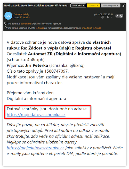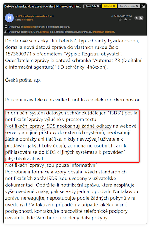 Navíc je každý e-mail opatřen certifikátem, který slouží jako další bezpečnostní prvek a pomáhá ověřit, že e-mail skutečně pochází z oficiálního zdroje