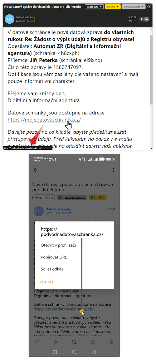 Kromě toho obsahují nové notifikace ještě upozornění – aby si příjemci dávali pozor na co klikají, zda příslušný odkaz vede na správnou, a nikoli na nějakou podvrženou adresu. S doporučením vytvořit si záložku v prohlížeči. Zmíněno je i opatření celé e-mailové zprávy pečetí agentury DIA.