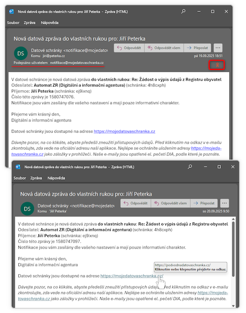 Řada programů již dnes umožňuje elektronické podepisování odesílaných zpráv, a vyhodnocuje elektronické podpisy na přijímaných zprávách. „Umí“ to například mnou používaný eM Client (viz předchozí obrázky), či hojně používaný Outlook. Na následujícím obrázku vidíte v Outlooku pravou (a řádně podepsanou) notifikaci v její nové podobě, a ve spodní části pak (nepodepsanou) podvrženou zprávu, které se prezentuje jako zaslaná ze stejné e-mailové adresy (notifikace@mojedatovaschranka.cz), a obsahuje zfalšovaný URL odkaz.