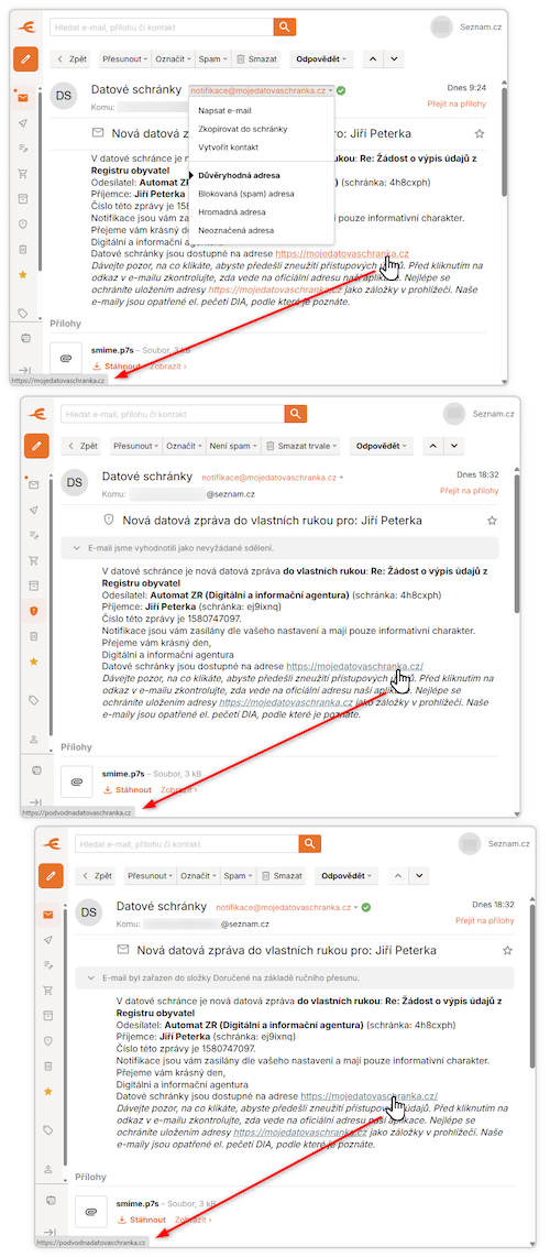 Konkrétně webmail Seznamu hned napoprvé označil adresu odesilatele skutečného (pravého) notifikačního e-mailu jako důvěryhodnou (viz horní část následujícího obrázku), zatímco zprávu s podvrženou adresou odesilatele a zfalšovaným odkazem vyhodnotil nikoli jako podezřelou z phishingu či jinak nebezpečnou, ale jen jako nevyžádané sdělení, a zařadil do složky spamu (viz prostředí část obrázku). Pokyn uživatele, že nejde o spam, interpretoval jako vyjádření důvěry v podvrženou adresu (kterou pak označil jako důvěryhodnou, viz spodní část obrázku), a zprávu přesunul do hlavní složky s doručenou poštou (a zde ji označil jako výsledek „ručního přesunu“).