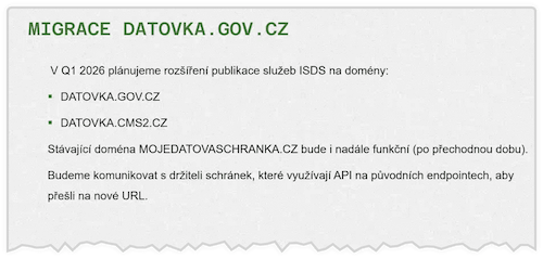 Pro širší uživatelskou veřejnost bude asi nejviditelnější stěhování datových schránek pod doménu gov.cz, konkrétně na adresu datovka.gov.cz. A to někdy v prvním kvartále příštího roku (2026). S tím, že stejně jako u dalších migrací pod gov.cz, zůstane dosud používaná doména, resp. adresa (mojedatovaschranka.cz) po určitou přechodnou dobu nadále funkční.