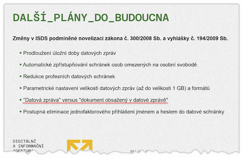 Agentura DIA má v hledáčku i další změny – a stejně jako řešení právě popsaného problému jsou všechny podmíněné změnou právní úpravy. Hlavně novelizací zákona č. 300/2008 Sb. o elektronických úkonech a autorizované konverzi. Takže jde spíše o určitá přání, která se může podařit realizovat, nebo také ne. Popišme si je postupně.