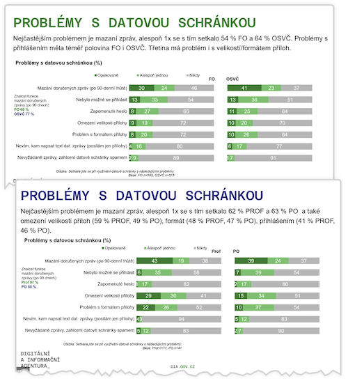Letos byly na veřejné konzultaci prezentovány výsledky průzkumu mezi uživateli, ze kterých (vcelku podle očekávání) vyplývá, že je to trápí asi ze všeho nejvíce. Překvapivě ale mazání datových zpráv po 90 dnech nejméně trápí (nepodnikající) fyzické osoby, přičemž nejrůznější diskuse o prodloužení úložní doby se dosud vedly hlavně v kontextu řešení právě pro jejich datové schránky - a nikoli pro schránky PFO, profesní schránky (PROF) či schránky PO.