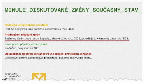 Kromě toho na veřejné konzultaci zaznělo i to, na čem agentura DIA již pracuje. Mj. na „oživení“ (redesignu) klientského portálu datových schránek, které by se mělo týkat jak vzhledu, tak do určité míry i funkčnosti, například pokud jde o možnosti vyhledávání. V současné době prý probíhá analytická fáze, realizace je očekávána v roce 2026.