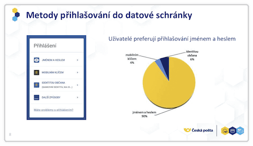 Dalším „evergreenem“, ve smyslu opakovaně diskutovaného záměru, je snaha lépe zabezpečit přihlašování uživatelů do datových schránek. Protože většina z nich se stále přihlašuje tím nejméně bezpečným způsobem – jen jménem a heslem, a tedy jen s jednofaktorovou autentizací. Což rozhodně neodpovídá dnešním požadavkům na bezpečnost, ani tomu, jak významné právní úkony lze skrze datové schránky činit.