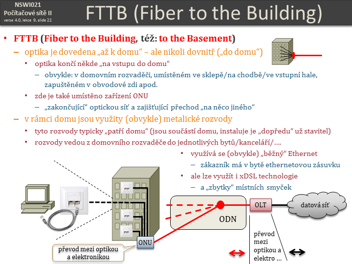 FTTB (Fiber to the Building) • FTTB (Fiber to the Building, též: to the Basement) – optika je dovedena „až k domu“ – ale nikoli dovnitř („do domu“) • optika končí někde „na vstupu do domu“ – obvykle: v domovním rozvaděči, umístěném ve sklepě/na chodbě/ve vstupní hale, zapuštěném v obvodové zdi apod. • zde je také umístěno zařízení ONU – „zakončující“ optickou síť a zajišťující přechod „na něco jiného“ – v rámci domu jsou využity (obvykle) metalické rozvody • tyto rozvody typicky „patří domu“ (jsou součástí domu, instaluje je „dopředu“ už stavitel) • rozvody vedou z domovního rozvaděče do jednotlivých bytů/kanceláří/…. • využívá se (obvykle) „běžný“ Ethernet – zákazník má v bytě ethernetovou zásuvku • ale lze využít i xDSL technologie – a „zbytky“ místních smyček